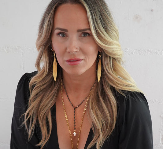 WARRIOR WITHIN Black Onyx Crescent Brass Leaf Dangle Earrings