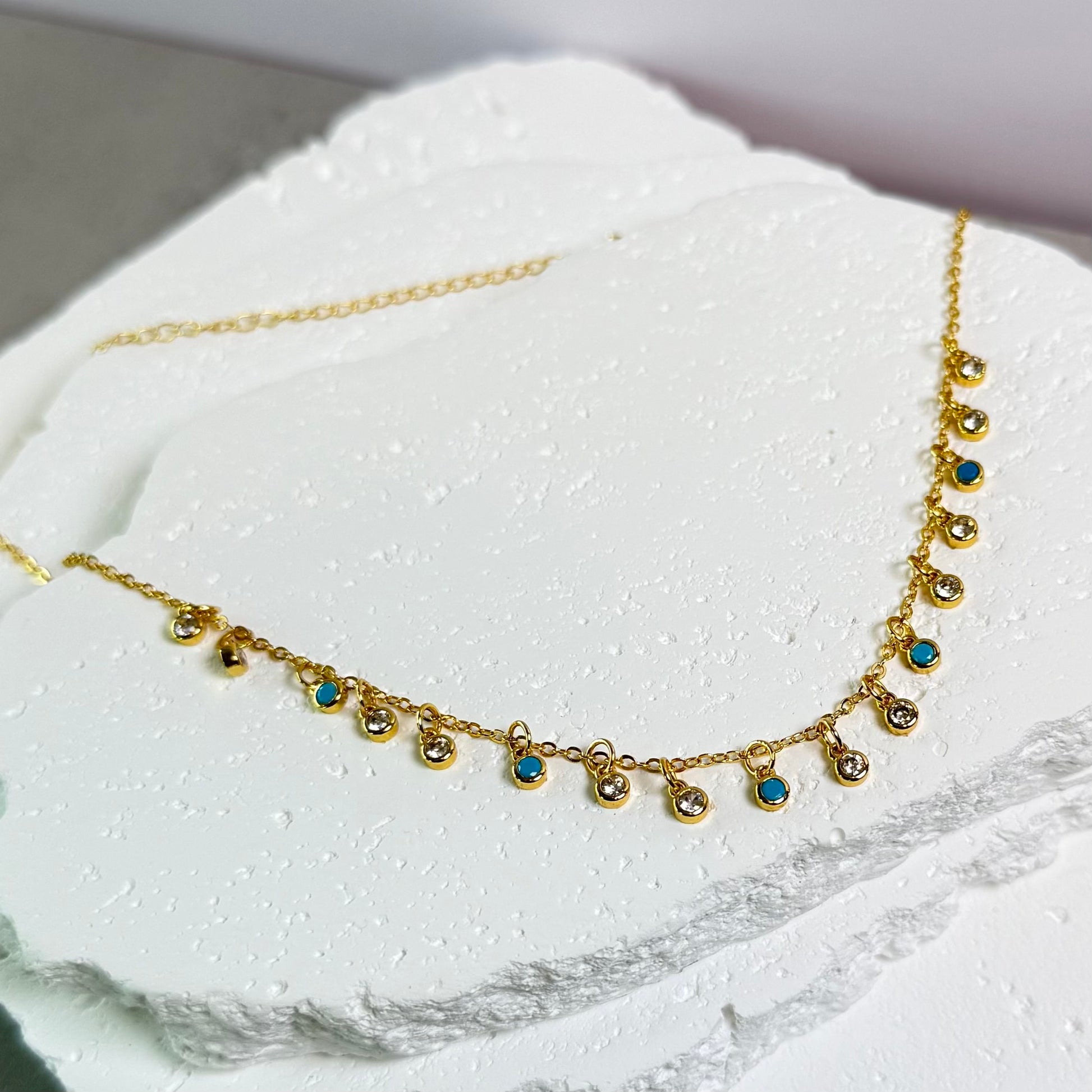 A treasure of the deep, the Atlantis Nights Tassel Necklace sways with effortless elegance, dancing on your chest like moonlight on ocean waves. Featuring a stunning mix of vibrant turquoise, sparkling CZ accents, and a delicate tassel, this piece radiates both mystery and charm.