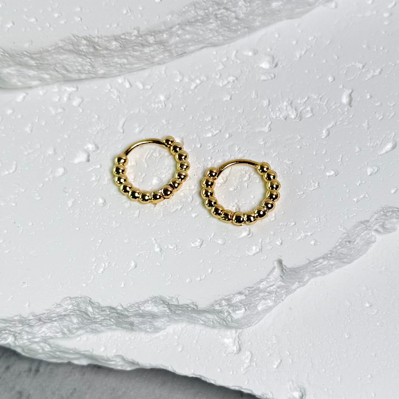 Introducing the Beaded Bliss Hoops, a pair of tiny gold-filled beaded hoop huggies that are perfect for everyday wear. These earrings offer a delicate and refined look, making them an ideal accessory to complement any outfit, from casual to chic.